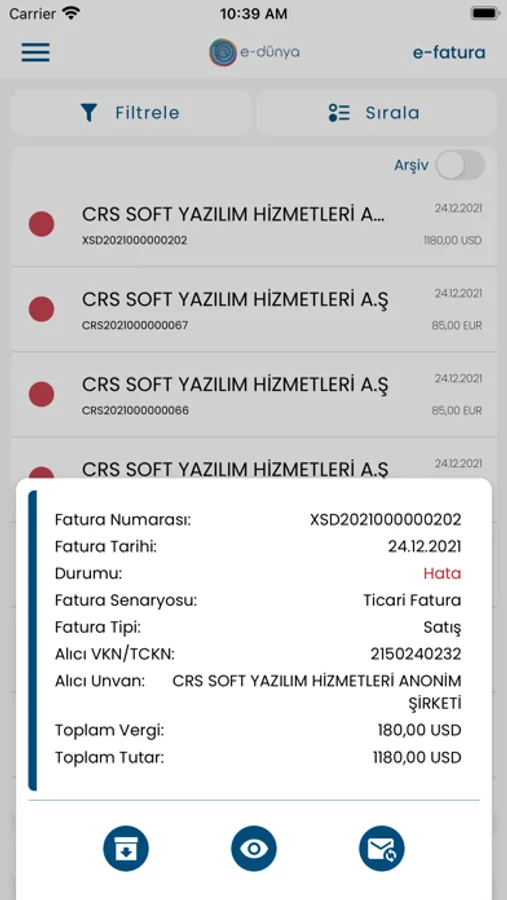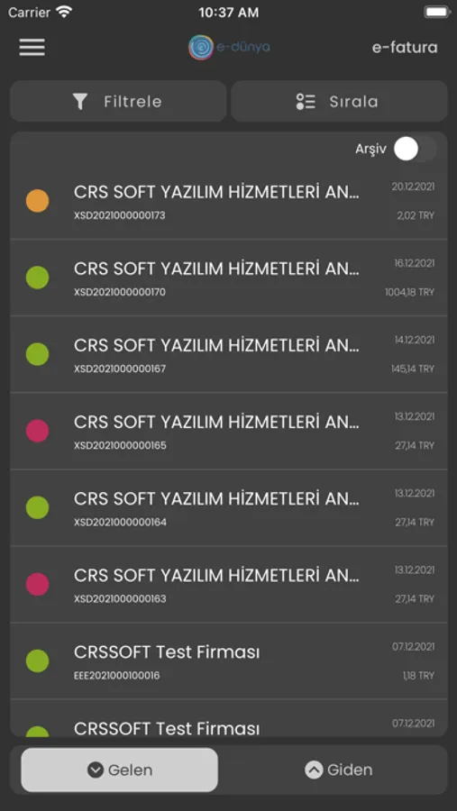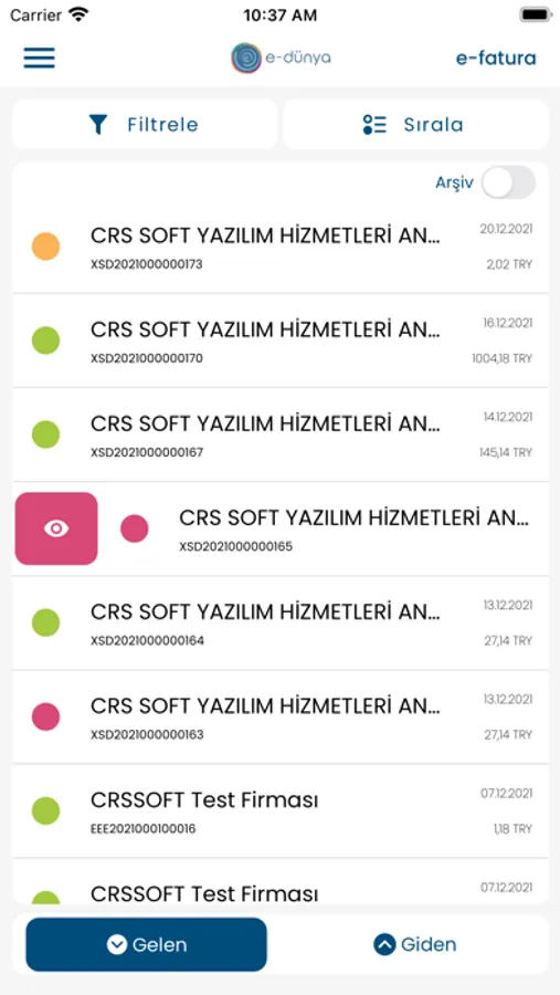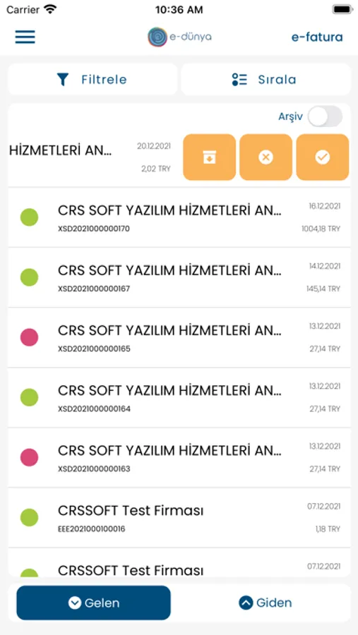 Arşiv butonuna dokunduğunuzda buton yeşil renkli hale gelir ve arşiv ekranına yönlendirir. Bu buton yeşil konumdayken listelenen belgeler, arşiv belgelerinizdir. Butona tekrar dokunduğunuzda eski haline döner ve tekrar arşiv listesinden çıkarak gelen veya giden e-faturalarınızın bulunduğu listeye dönersiniz.