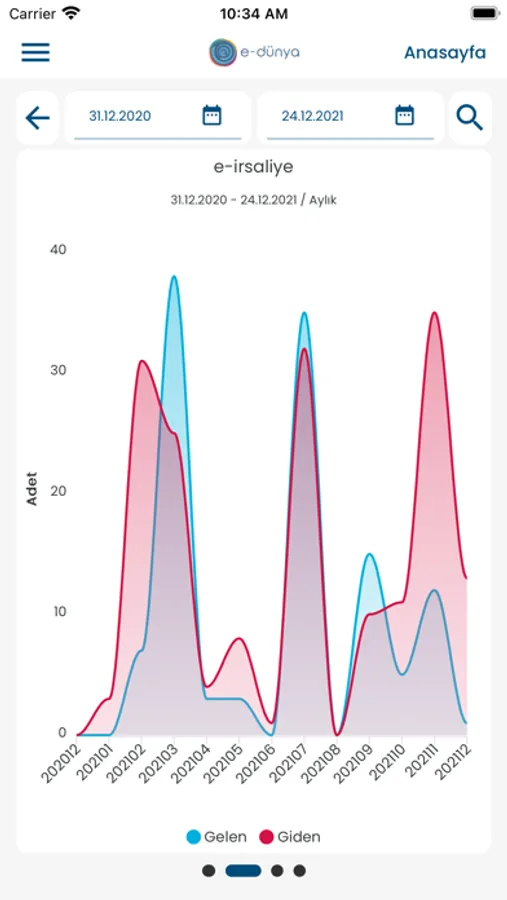 Giriş yaptıktan sonra yönlendirildiğiniz Anasayfa ekranında hizmet aldığınız belgeleriniz için hazırlanmış raporlama grafikleri bulunmaktadır. Ekranı sağa ve sola kaydırarak belgelerinizin belirlenen periyodlardaki istatistiklerine dair rapor grafiklerini görüntüleyebilirsiniz.