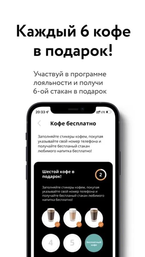 - Возможность вступить в программу лояльности «6-ой стакан в подарок»