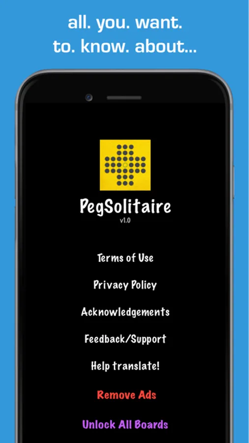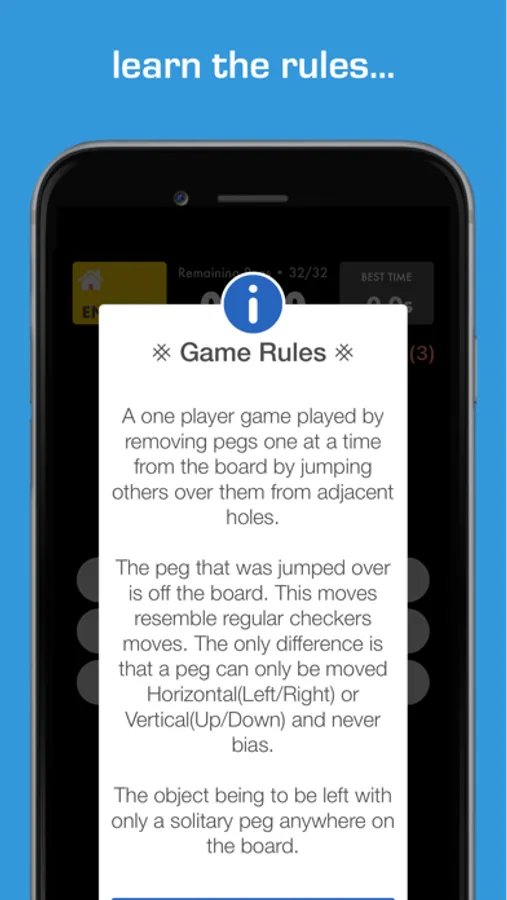 Peg Solitaire Unlimited is a single player board game. The original game was invented by a French aristocrat in the 17th century, explaining the less common name Solo Noble. It is also called as Brainvita (especially in India). This app is more than a tradtional Peg Solitaire extending with more boards and unlimited play. It includes upto 32 boards and more boards to come.