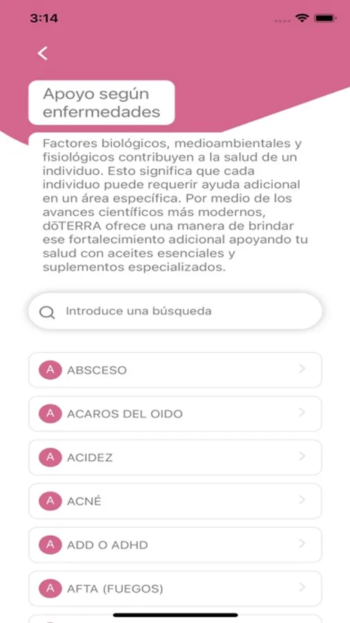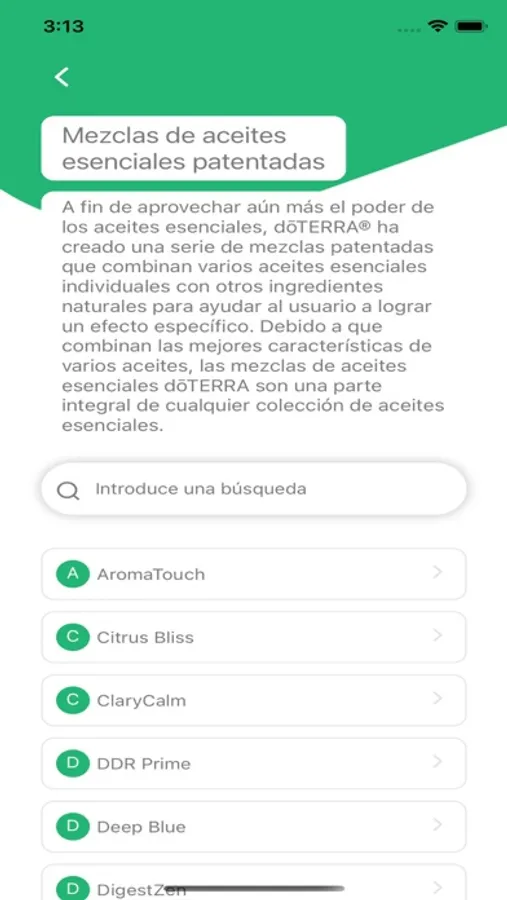 La aplicación presenta una sección de guía que detalla más de 250 condiciones de salud para las cuales los aceites esenciales se usan comúnmente para ayudar a respaldar la capacidad natural del cuerpo para curarse a sí mismo. Además, puede encontrar información sobre más de 60 aceites individuales y 19 mezclas de aceites disponibles comercialmente que lo ayudarán a comprender y usar mejor los aceites esenciales.