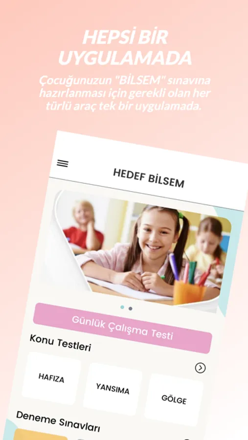 Hedef Bilsem uygulaması, genel zihinsel yetenek, müzik ve resim alanlarından Ön Değerlendirmeye (Birinci aşamaya) girecek adaylar için her yetenek alanına özel hazırlanmış çalışma etkinlikleri ile harika bir hazırlık kaynağıdır.