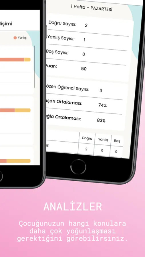 - Öğrencinizin hangi konudan ne kadar soru çözüldüğünü, çözülen soruların doğru, yanlış ve boş oranlarını inceleyerek konu bazlı gelişimini takip edebilirsin.