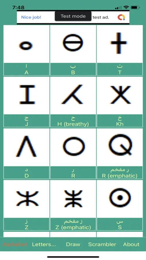 استخدم هذا التطبيق لتعلم التيفيناغ وهو أبجدية اللغات الأمازيغية في شمال أفريقيا (التمزيغت والتشلحيت وغيرها) نقترح استخدام صفحة الأبجدية حتى يتعرف المستخدم على الحروف قليلا ثم استخدام صفحة اختبار الحروف. حتى يشعر بأنه يستطيع تحديد بعض الحروف بالسهولة. بعد ذلك فنقترح استخدام لعبة "سكرامبل" التي تتكون من ٦ دروس يقوم المستخدم فيها ببناء الكلمات حرفا بحرف. نقترح تكرار كل درس أكثر من مرة أو تحديد أكثر من درس للمراجعة. كل درس يحتوي على حروف جديدة وحروف قد تم تعلمها سابقا. الكلمات المستخدمة مأخوذة من قاموس يحتوي على عدة لهجات منها التامازيغت والتشلحيت والقبائلية وغيرها من لهجات. من المهم أيضا أن يكتب الطالب الحروف على الورقة بالقلم كي يكتسب مهارة الكتابة بالإضافة إلى القراءة. إذا أعجك التطبيق فلا تنسَ أن تترك لنا تقييما :). نتمنى أن تستفيد/ين!