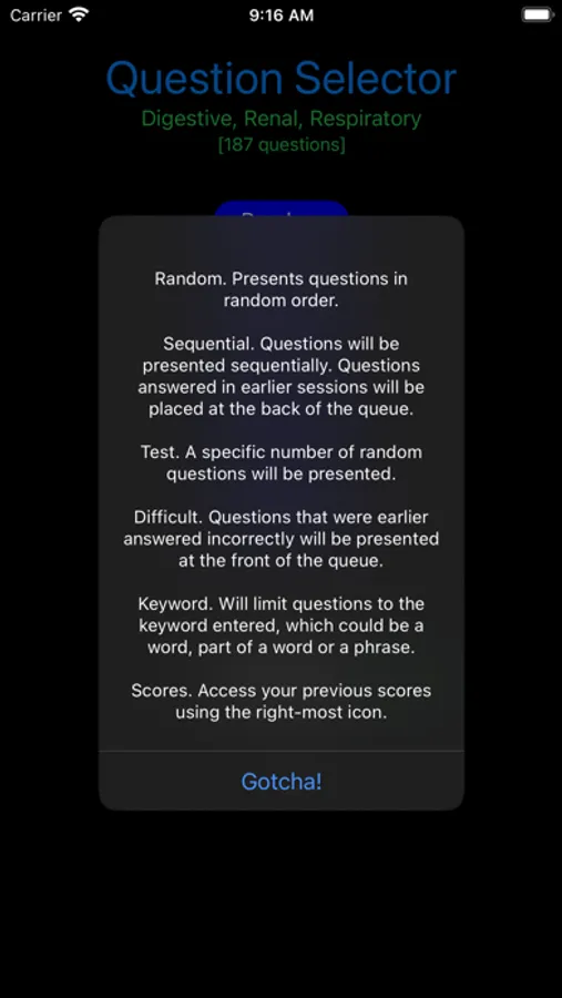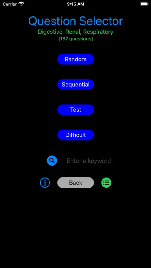 Keyword mode. Presents questions that match a keyword (within the question text)