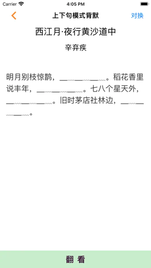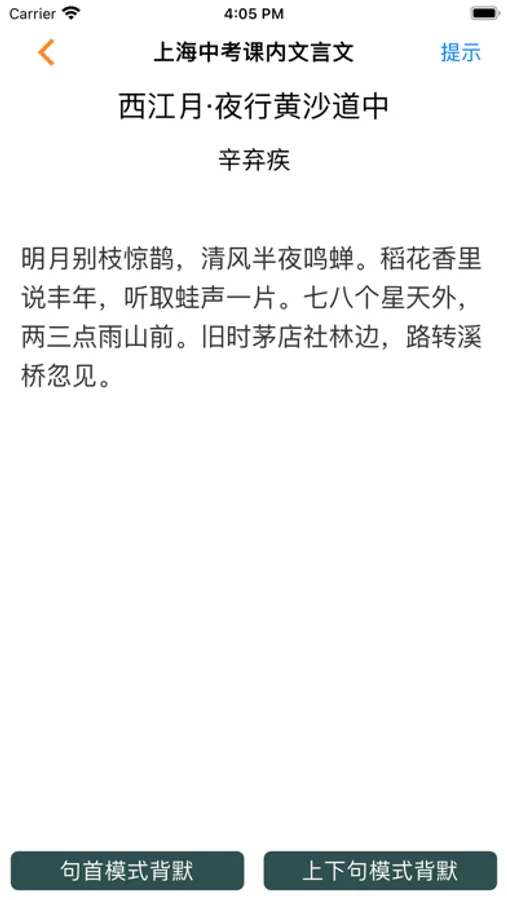 为了更有效和持久地背默文言文, 尤其是上海中考课内文言文默写篇目,本应用提供了句首模式和上下句模式,使用步骤如下:1. 尝试理解文言文的内容。2. 进入句首模式或上下句模式,尝试背默留白部分的内容。3. 对暂时不能背默的部分, 可以点击屏幕下方的翻看按钮。4. 在熟练背默留白部分的内容后,点击屏幕右上方的对换按钮,进入第2步,直至熟练。5. 尝试背默全文,直至熟练。
