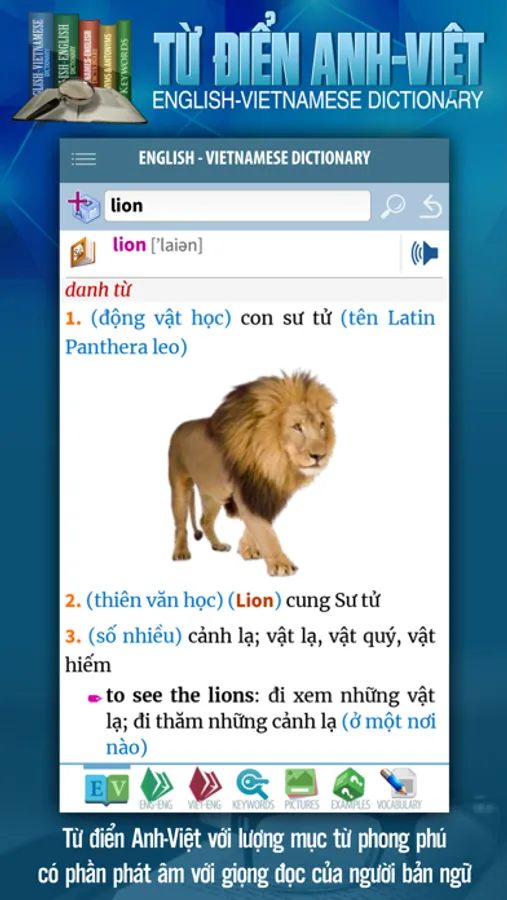 - Từ điển Anh-Việt với 300.000 từ có đầy đủ phát âm và gần 5.000 hình minh họa.