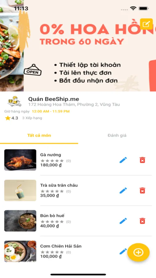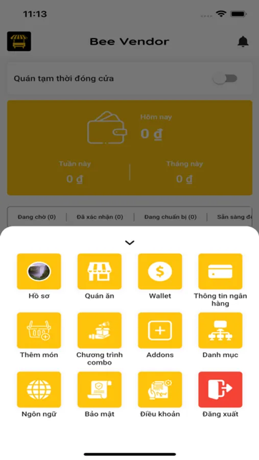 BeeVendor là ứng dụng dành cho chủ quán ăn. Ứng dụng gồm các chức năng nhận đơn, xử lý đơn hàng. Thêm, sửa xoá món ăn, ảnh bìa, giảm giá,....
