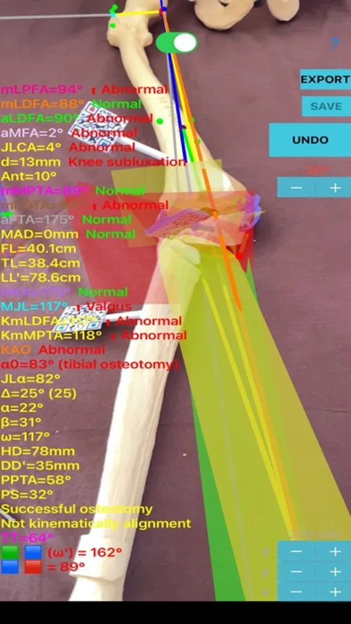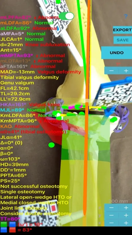 - calculations in a instant of the mechanical axis deviation (in mm) MAD, anatomical and mechanical femoral axes angle (aMFA), mechanical lateral proximal femoral angle (mLPFA), mechanical lateral distal femoral angle(mLDFA), joint line convergence angle (JLCA), mechanical medial proximal tibial angle (mMPTA), mechanical lateral distal tibial angle (mLDTA), Hip Knee Ankle line (HKA) and Mid joint line (MJL). orientation that gives the surgeon valuable objective informations.