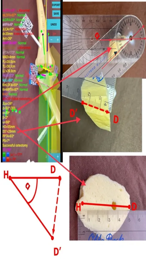 - to combine correction - namely biplanar- at coronal plane (a angle) and sagittal plane (β angle) by real time measuring the previous angles, tibia slope, tibia torsion and provides the direction of the osteotomy plane (ω angle) in which (open or closed) should be made, the height the opening or closing of the wedge and the correction angle (Δ angle) which values are update in real time continuously.