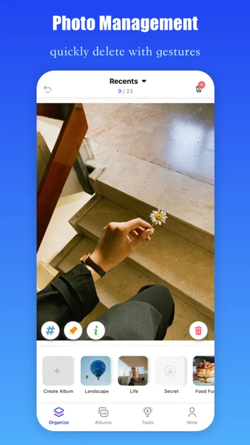 Gesture-based rapid organization, quickly delete unwanted photos, and add photos to designated albums anytime.