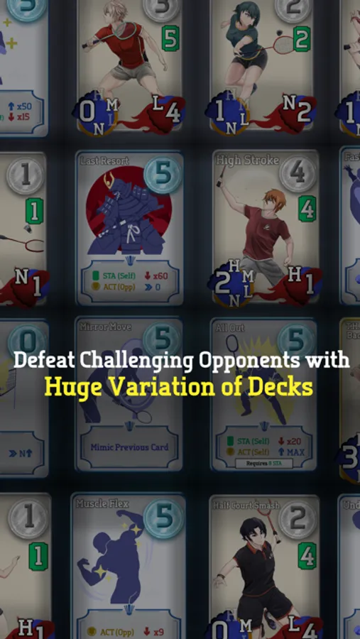 Unique fast-paced Card battle where each players takes turn controlling the shuttlecock's Position and Speed with cards, until one side fail to receive. The basic concept of the Card battle is simple enough to understand without prior badminton knowledge, but deep enough to provide challenge for any Card game and Card RPG lovers.