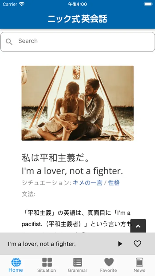 同じカテゴリーの中でも、右スワイプでランダムにフレーズを出すこともできて、楽しみながらネイティブならではの「生きた英語」フレーズをどんどん覚えていくこともできます。