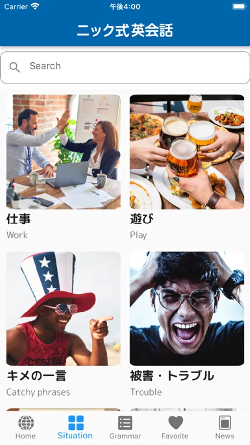 「文法検索」「シチュエーション検索」「キーワード検索」と検索機能が豊富で、調べたいフレーズも簡単に検索できます。