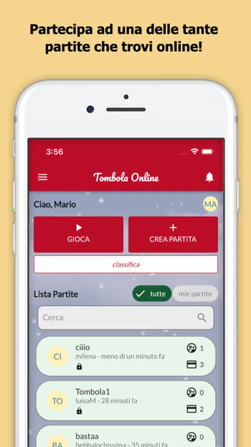 Puoi cercare subito una partita ed unirti ai migliaia di giocatori che giocano a tombola ogni giorno su Tombola Online, oppure puoi creare una partita privata ed invitare i tuoi amici per giocare a Tombola.