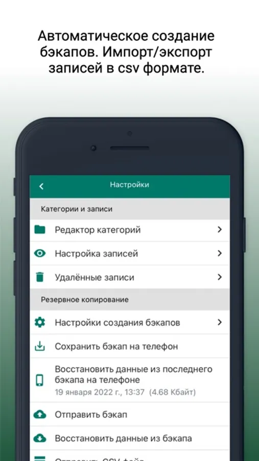For additional security of your data, the function of automatic blocking of the application is implemented, as well as the function of automatic deletion of entries in case of loss or theft of a mobile device.