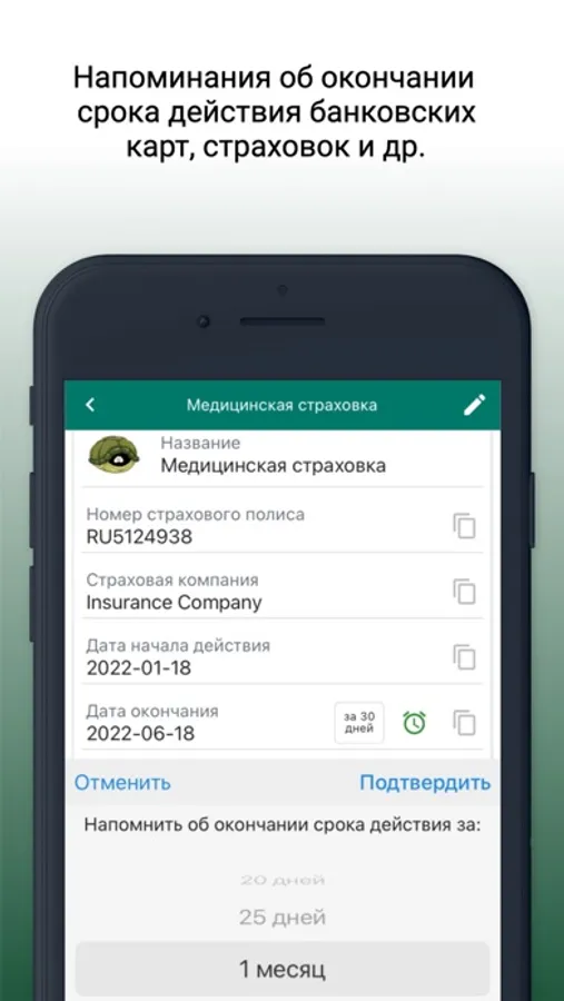 Certain categories support the function of setting a reminder about the expiration date of your bank card, passport, etc. You just need to activate this function for the created entry and choose for what period before the end you would like to receive a reminder.