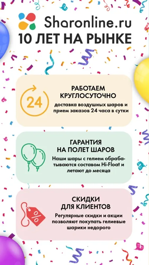 Sharonline.ru - служба доставки воздушных шаров и товаров для праздника. Мы на рынке более 10 лет и нам доверяют более 150 000 клиентов. Мы пропагандируем индивидуальный подход к каждому клиенту нашей компании и готовы помочь в исполнении его желаний. Мы всегда находим оптимальное решение для каждого.