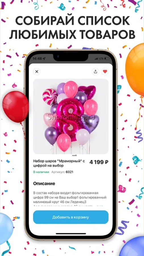 В приложении Sharonline.ru вы сможете приобрести фигуры из шаров любой сложности, найти набор воздушных шаров с гелием на любой вкус и цвет, купить всё необходимое для сервировки стола и заказать букет цветов. Широкий ассортимент нашего каталога, позволяет любому найти что-то по душе.