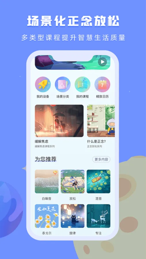从入门到进阶,多种场景化正念放松课程,结合正念引导性训练和沉浸式体验,帮助用户改善睡眠,调节情绪,缓解压力,消除负能量,减少大脑中的杂念。通过正念音乐及大脑遐想,提升智慧生活品质,释放生活压力,保持良好精力。