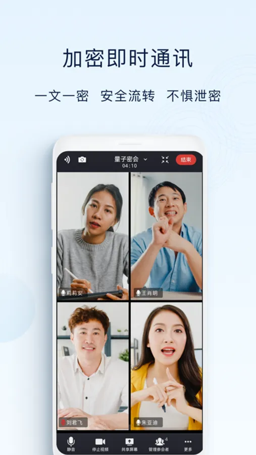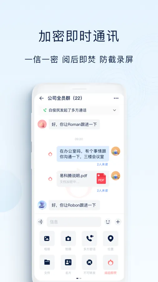 量信是以密码技术为核心的企业加密通讯与安全协同办公平台。构建以“用密码定义边界”为宗旨的数据安全防护体系,保障企业数据从产生、传输、存储、分类、共享、销毁全生命周期的数据安全。集成密话、密信、密会、密视频、密线、密文、密盘、密友通讯录等八大加密应用,结合零信任、数据防泄漏、安全沙箱等多种安全技术,对企业通讯和办公场景下的云、管、端数据进行全程加密保护。