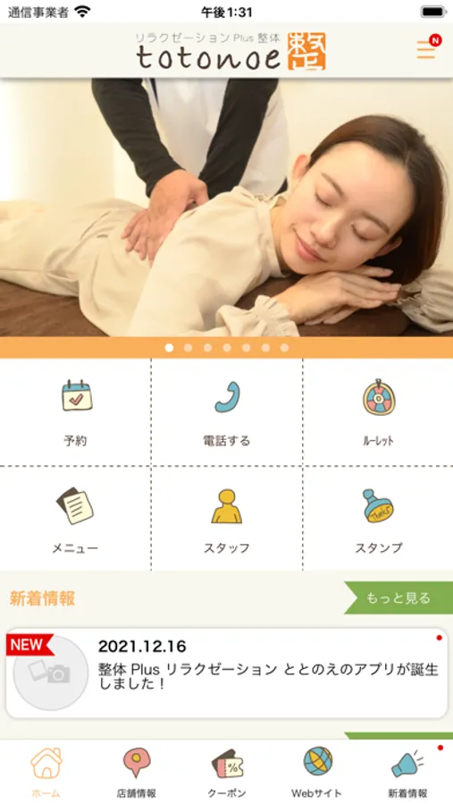 整体 Plus リラクゼーション ととのえの公式アプリが登場。アプリを通して『ととのえ』の新着情報やお得な情報をリアルタイムで受け取ることができます。また、いつでもお手元のスマートフォンから、メニューやご希望のお時間帯のチェック・ご予約などが可能です。アプリをインストールしていただくことにより『ととのえ』を、より便利に身近にご利用していただけます。