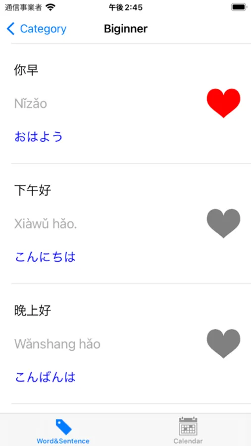 ・基本的な単語や文章の日本語、中国語、発音を記載