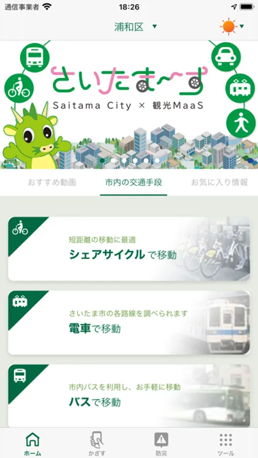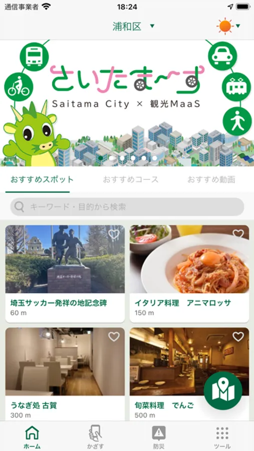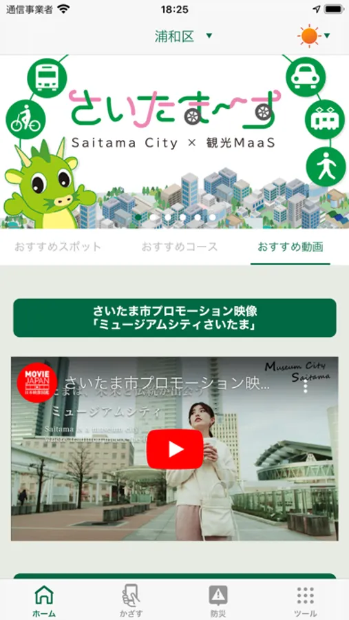 ・「ホーム」では、さいたま市の観光に役立つ交通案内、魅力を感じられるおすすめ動画、名所を巡れるスポット情報、期間限定イベントのスタンプラリー、様々なジャンルのおすすめコースの確認ができます。