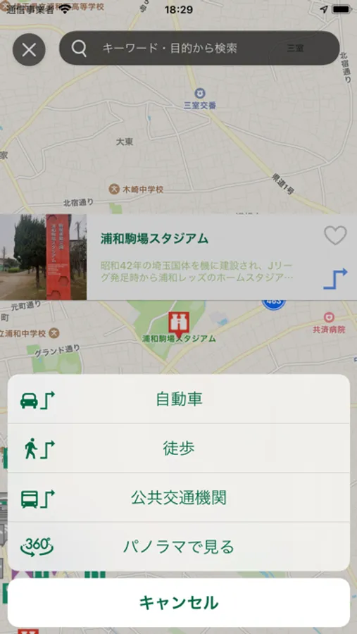 ・目的地を、徒歩、車、電車の中から、最適なルートで経路案内が可能です。