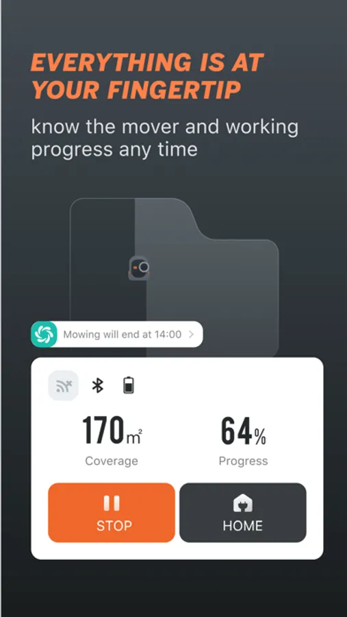 4. Monitor the mower at any time. You can check the mower status, mowing progress, remote control the mower to start or stop working whenever you want.