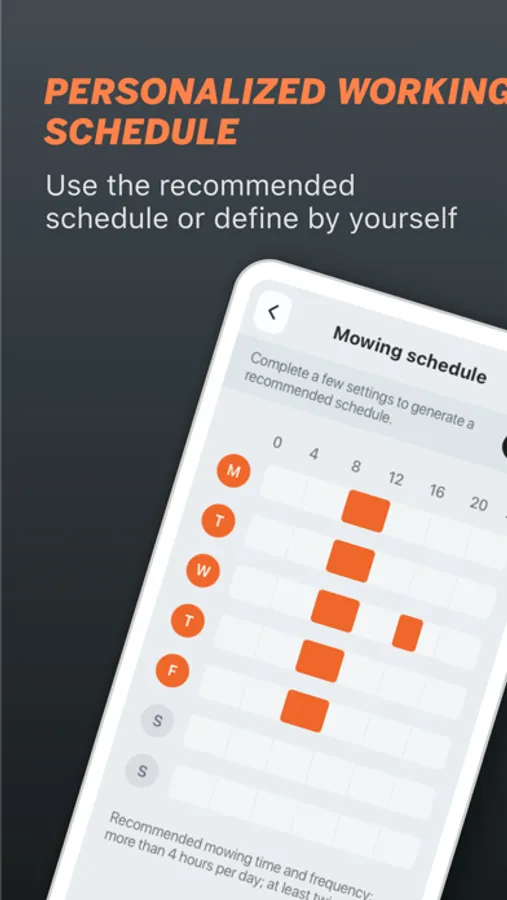 3. Set the mowing schedule. You can either choose to use the recommended schedule auto-generated based on your preferences or select the mowing time by yourself.