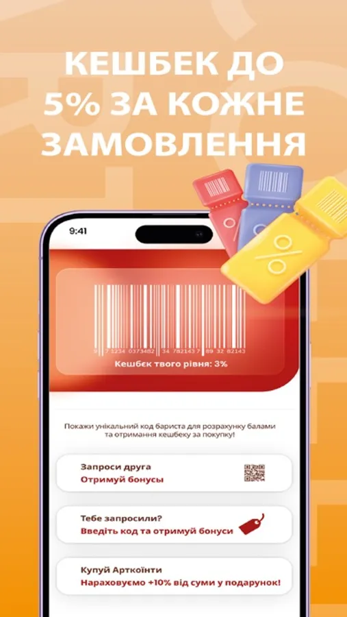 Кожен раз, коли ви здійснюєте покупку у кав'ярні, зареєстрованій в додатку, ви отримуєте кешбек від 1% до 5%, залежно від суми покупки.
