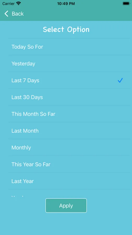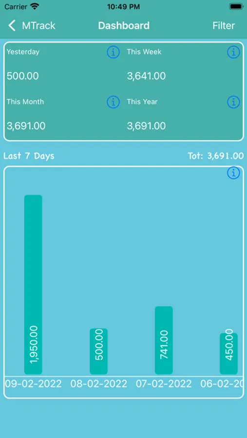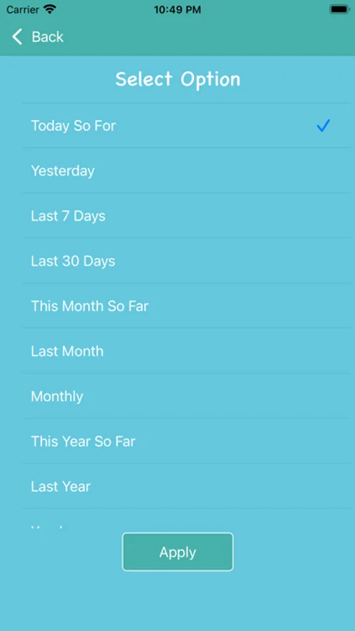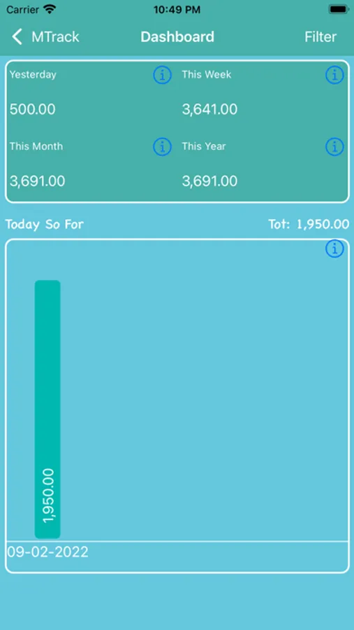 Track Month App has a Filter Option which helps to filter data by Today so far, Yesterday, last 7, 30 days, This Month So Far, Last Month, Monthly, This year so far, Last Year, Yearly, Custom, All Time.