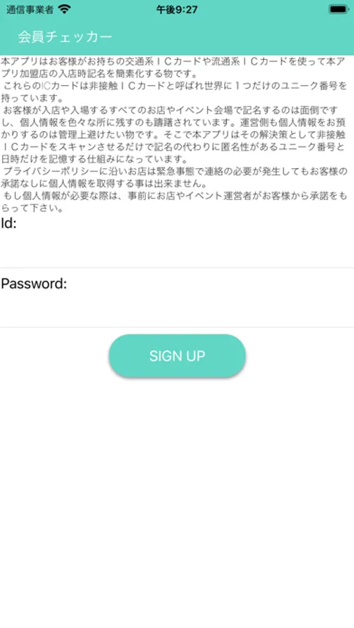 本アプリはお客様がお持ちの交通系ICカードや流通系ICカードを使って本アプリ加盟店の入店時記名を簡素化する物です。