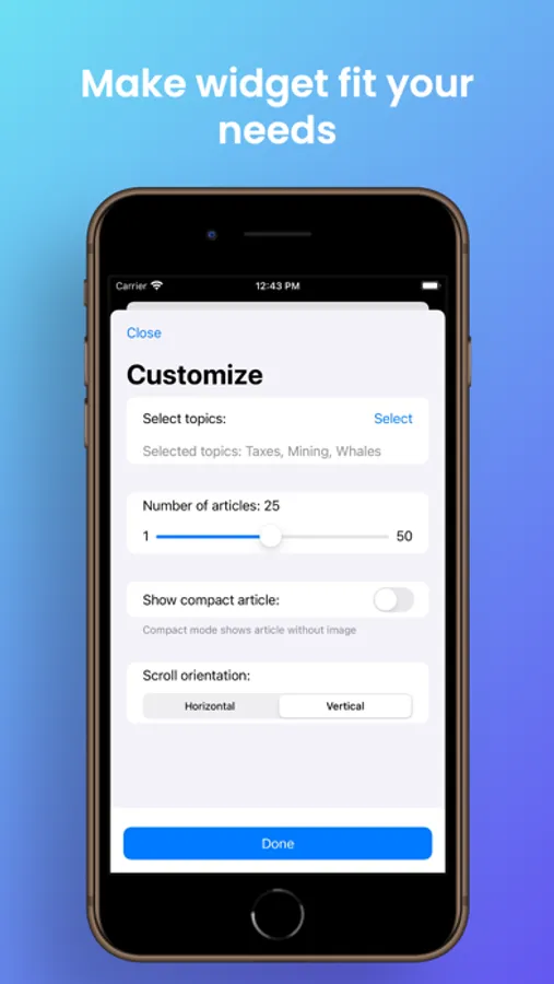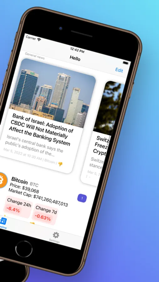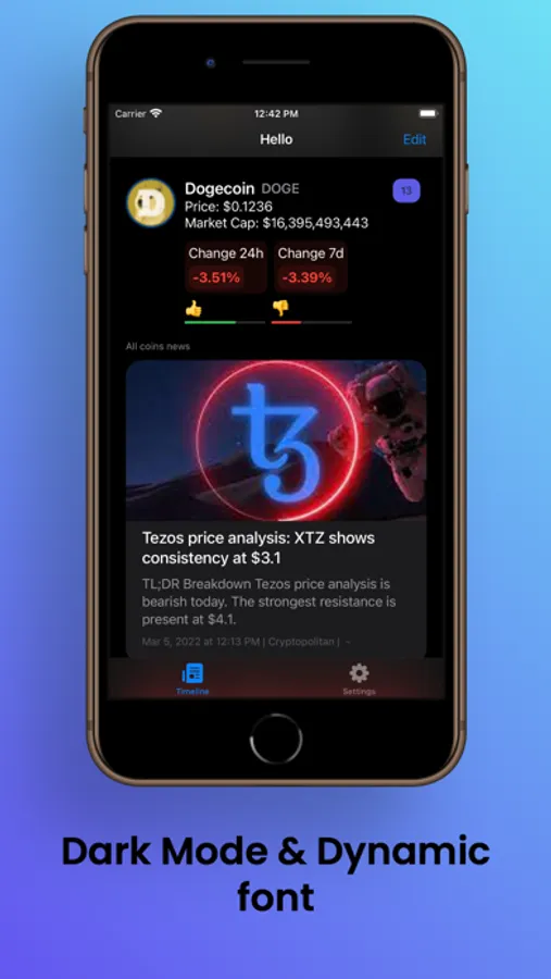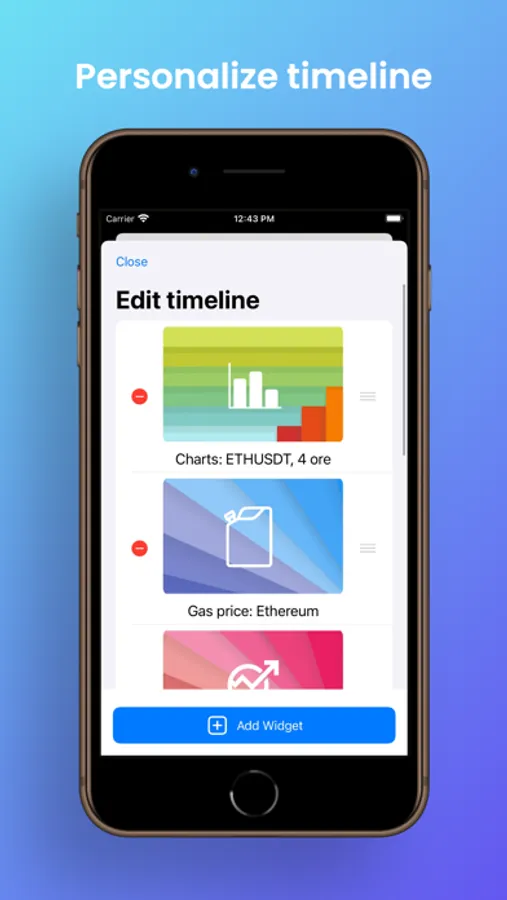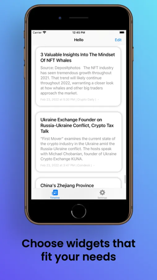 The crypto news and market data are organized into widgets within a timeline creating a seamless experience when checking them. You can add, remove or reorganize any type of widget in order to make the timeline show exactly the data you are looking for