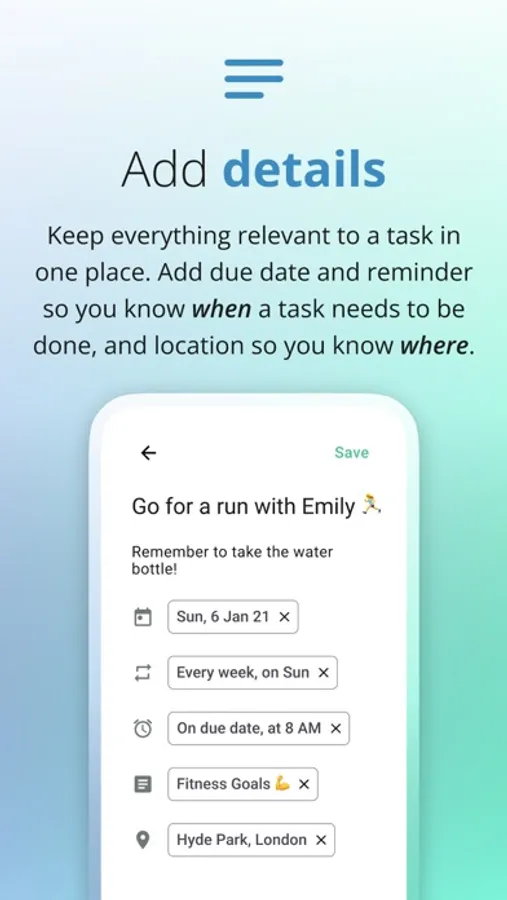 • Add location to tasks to remember where something needs to be done (PRO subscription required)