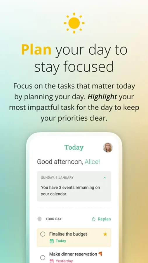• Plan your day to focus on only the tasks that really matter today, and highlight your most impactful task for the day to help you prioritise it