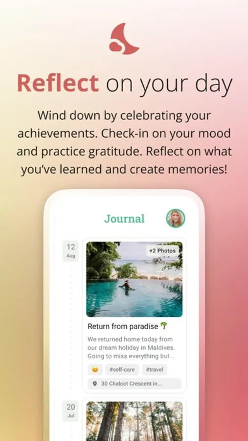 * Reflect on your day by reviewing your achievements, checking-in on your mood, practicing gratitude, and journaling your thoughts