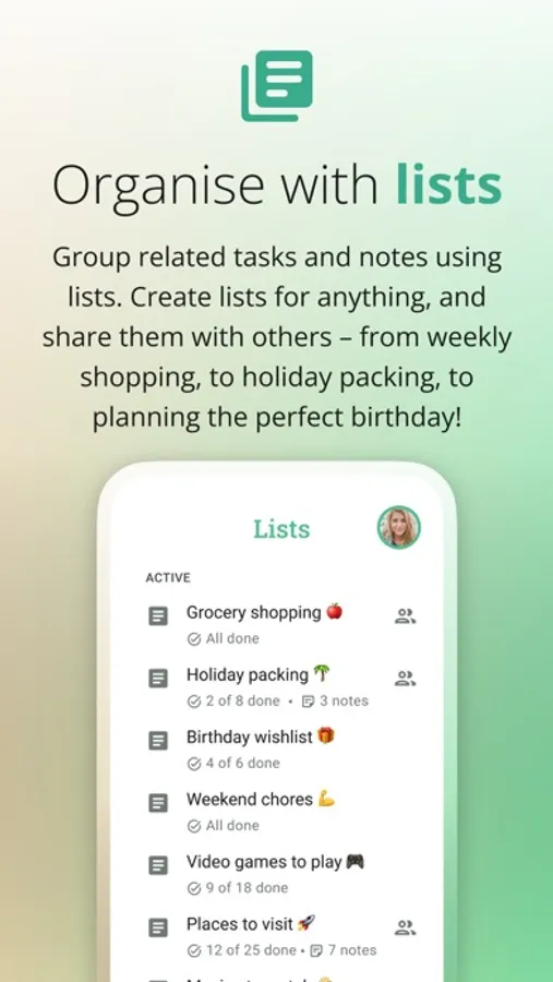 • Create lists to group your related tasks and notes together, for better organisation