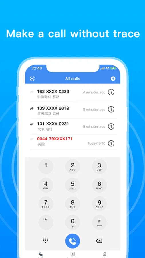 Automatically and intelligently match the network, the other party does not need to install an Internet phone or connect to the Internet; hiding the number without traces will give him an unexpected surprise!