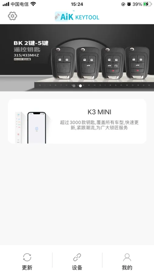 “AiK钥匙工具”用于遥控数据查询、生成等,用户通过蓝牙连接K3 MINI等硬件设备,可以实现多种遥控(汽车、摩托车、电动车、车库门)等的拷贝、固件升级等。