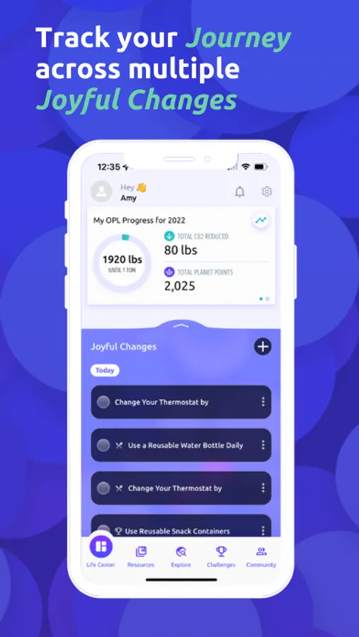 One Planet Life makes it easy to take action against the climate crisis that fits into your unique lifestyle. Each journey features specific actions you can take and track to build sustainable habits. With each action, you’ll see a reduction in carbon emissions related to each joyful change. Start tracking your eco-activities or “joyful changes” and see how your sustainable habits reduce your carbon footprint. Invite friends to join you on and participate in challenges to build sustainable habits, and watch your impact grow when others take the same actions against climate change to reduce our impact on the environment.