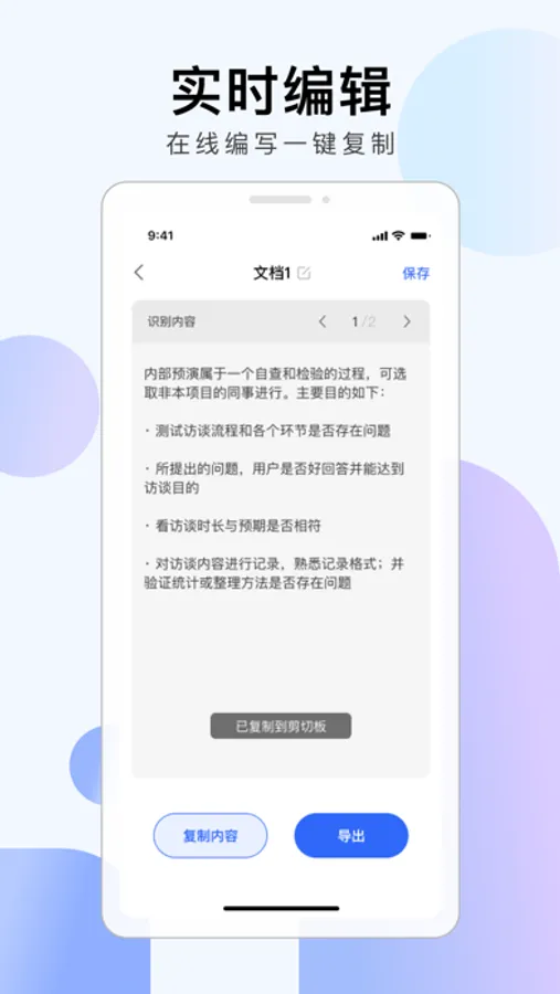 【编辑复制】识别结果完整保存,也可进行自由编辑,支持一键复制到剪切板。