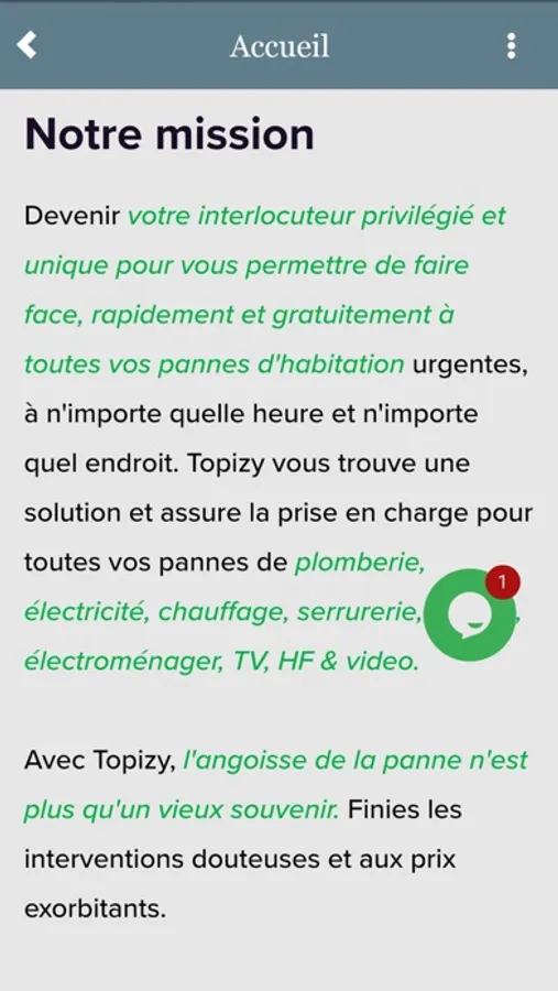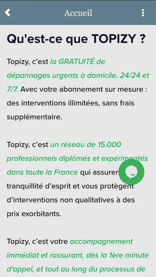 L'application permet d'entrer directement en contact avec le centre d'appel en cas de panne et obtenir gratuitement un dépanneur en urgence (déplacement, pièces et main d'oeuvre inclus - voir conditions). Vous pouvez ajouter des abonnements, des adresses de souscription. Consulter toutes les informations et les vidéos de présentation du service de dépannage d'urgence TOPIZY.