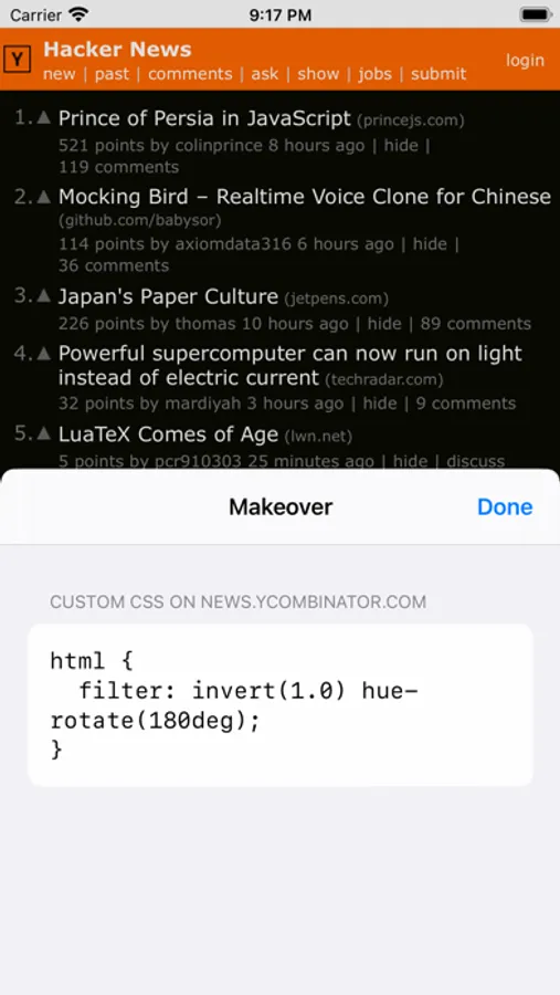 Makeover lets you change the appearance and behavior of web pages with CSS and JavaScript. To use it, you go to a web page you want to customize, tap the Makeover icon, and paste the code into the text field.