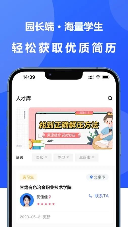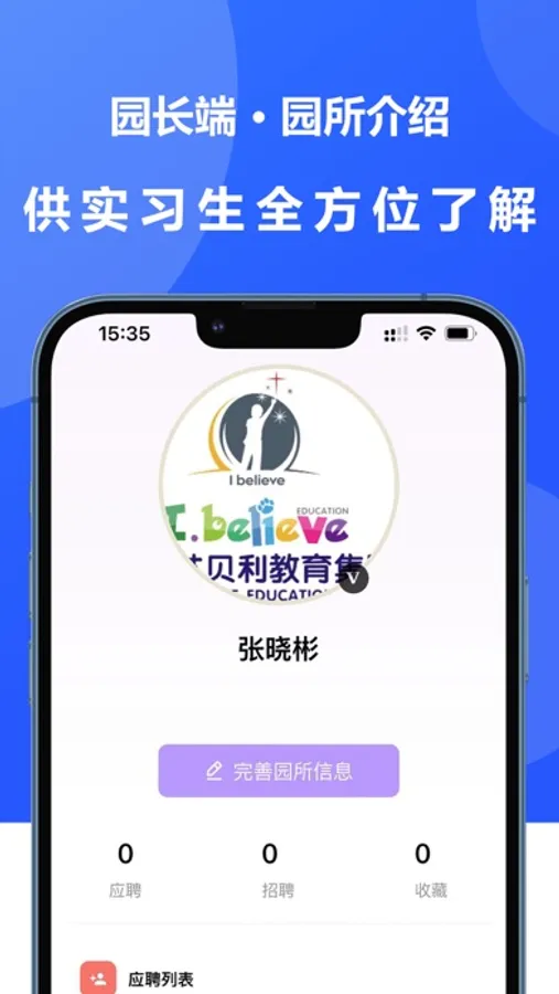 中贝未来APP园长端, 专注学前教育互联网领域,依托中贝未来学前教育学院,专注学前教育幼师实习,就业10余年;海量师资人才库;文字+视频+学院老师评价,个性化电子真实微简历,更真实,更可靠,更省时省事;就业稳定; 师资稳定; 降低实习就业试错率;节省成本 ; 增加营收;幼儿园,托育,早教 ,学校师资专业招聘平台;幼教,实习生专属招聘工具。