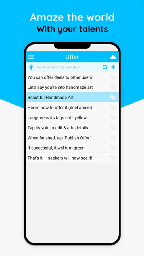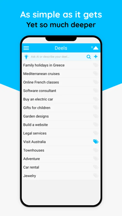 Deel lets you create notes of anything you want to do and achieve – your deels – with the power of AI. You can seek matching offers by other users for your deels, or turn your deels into offers for other users.