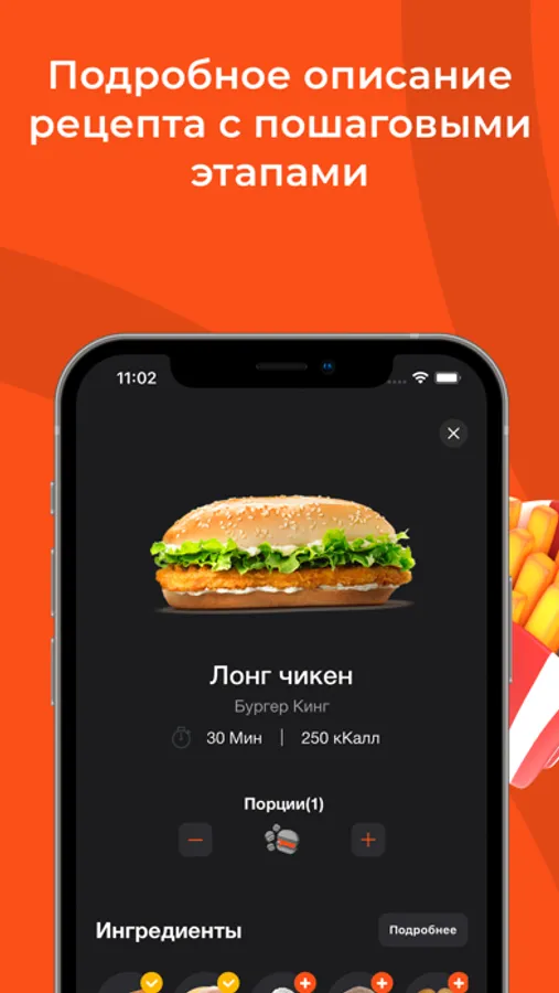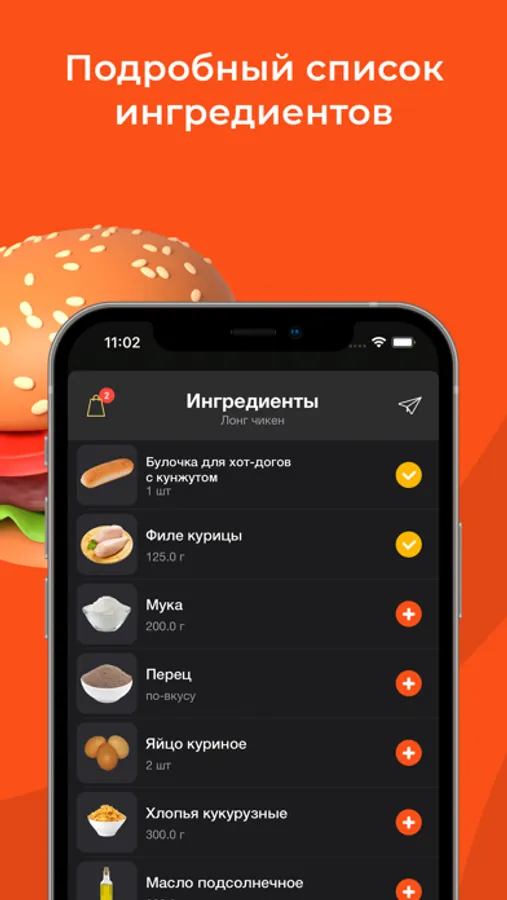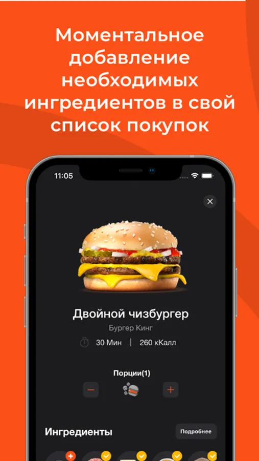 Моментальное добавление необходимых ингредиентов в свой список покупок, с возможностью поделиться с другом.