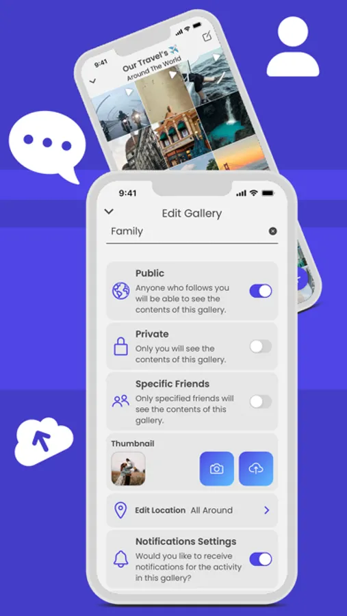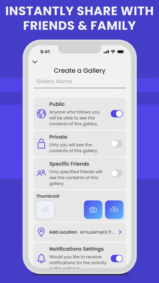 Create Public, Private, or Specific Friends Shared albums where both you and them can upload pictures and video to share in real-time with each other. As a creator of the gallery you will have control over who is able to access the gallery album. You will also be able to Save media to your camera roll as well as have the ability to delete media that doesn’t belong there.