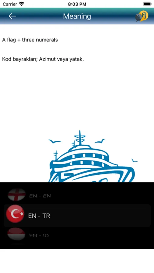 Maritime dictionaries in English, Turkish, Indonesian, Filipino, Hindi, Korean, Vietnamese, Japanese, Arabic and Russian. Find the word choose your language and find its meaning easily and offline.